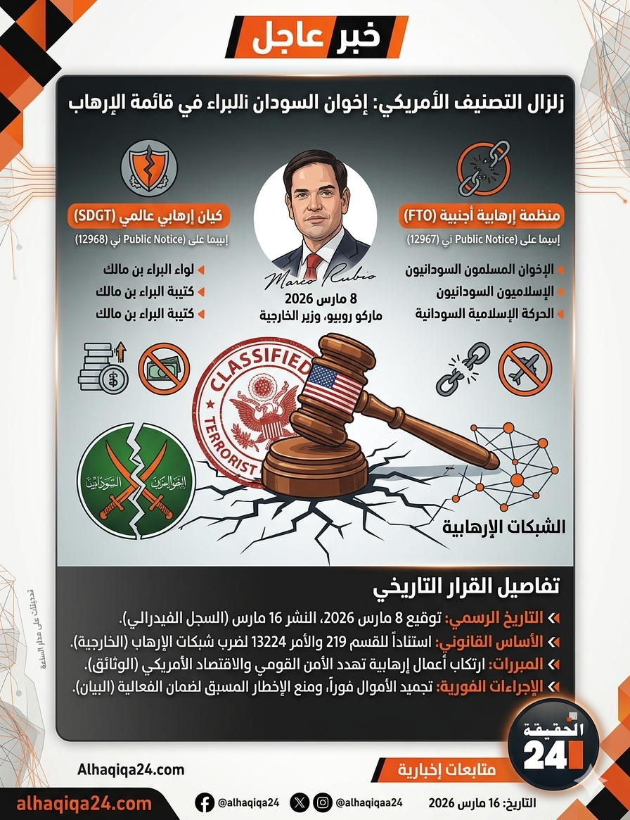 أصدرت وزارة الخارجية الأمريكية قرارين رسميين يصنفان جماعة الإخوان المسلمين السودانيين كمنظمة إرهابية أجنبية وكيان إرهابي عالمي مصنف بشكل خاص. وجاء القراران بتوقيع وزير الخارجية ماركو روبيو بتاريخ 8 مارس…